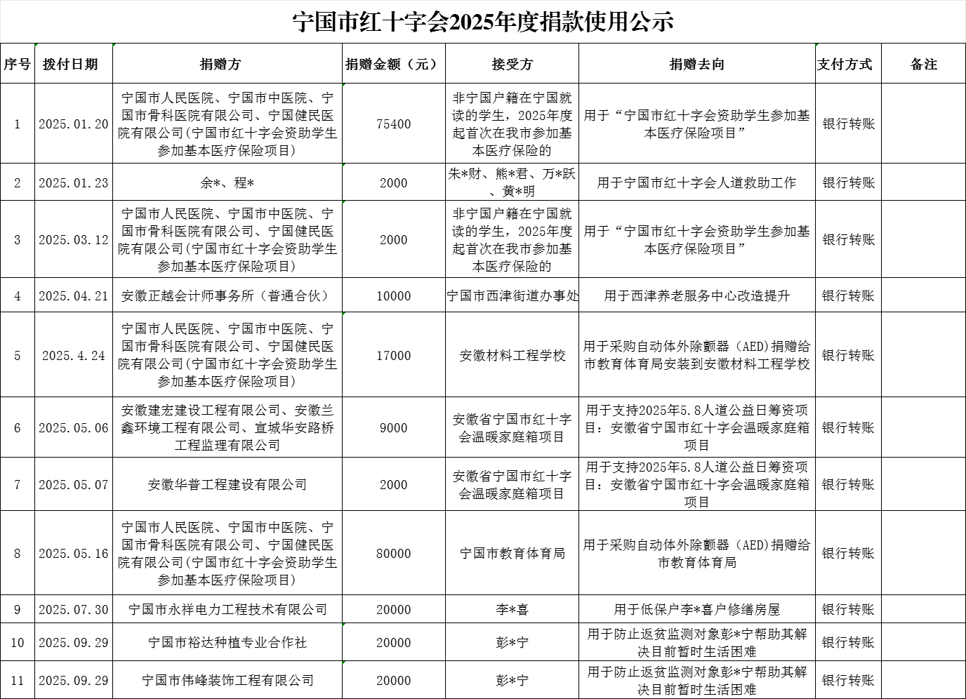 宁国市红十字会2025年度接收捐款公示