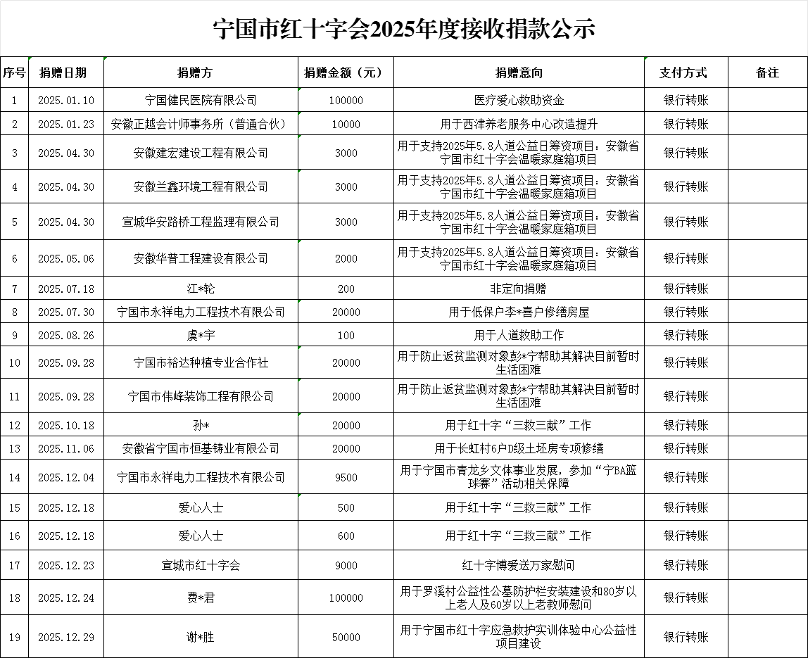 宁国市红十字会2025年度接收捐款公示