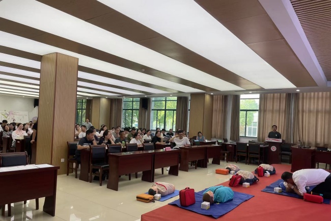 为进一步普及应急救护知识,提高教职工应对突发事件和意外伤害的能力,5月12日下午,宁国市红十字会受邀前往安徽材料工程学校开展了一场心肺复苏(CPR+AED)单项培训,共计100余名班主任、体育老师、宿舍管理员等教职工参加了培训。